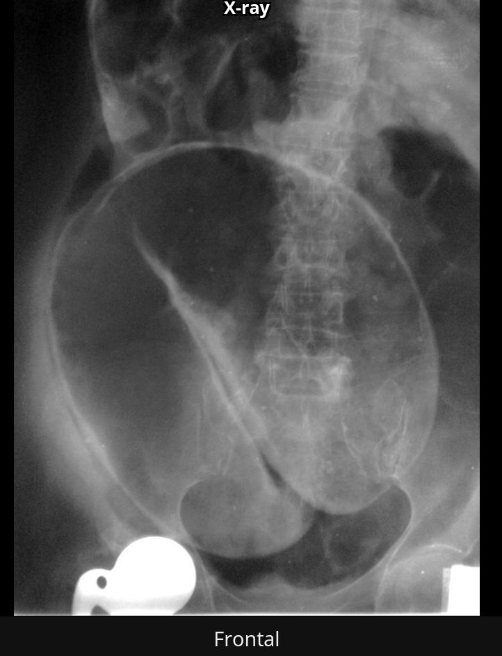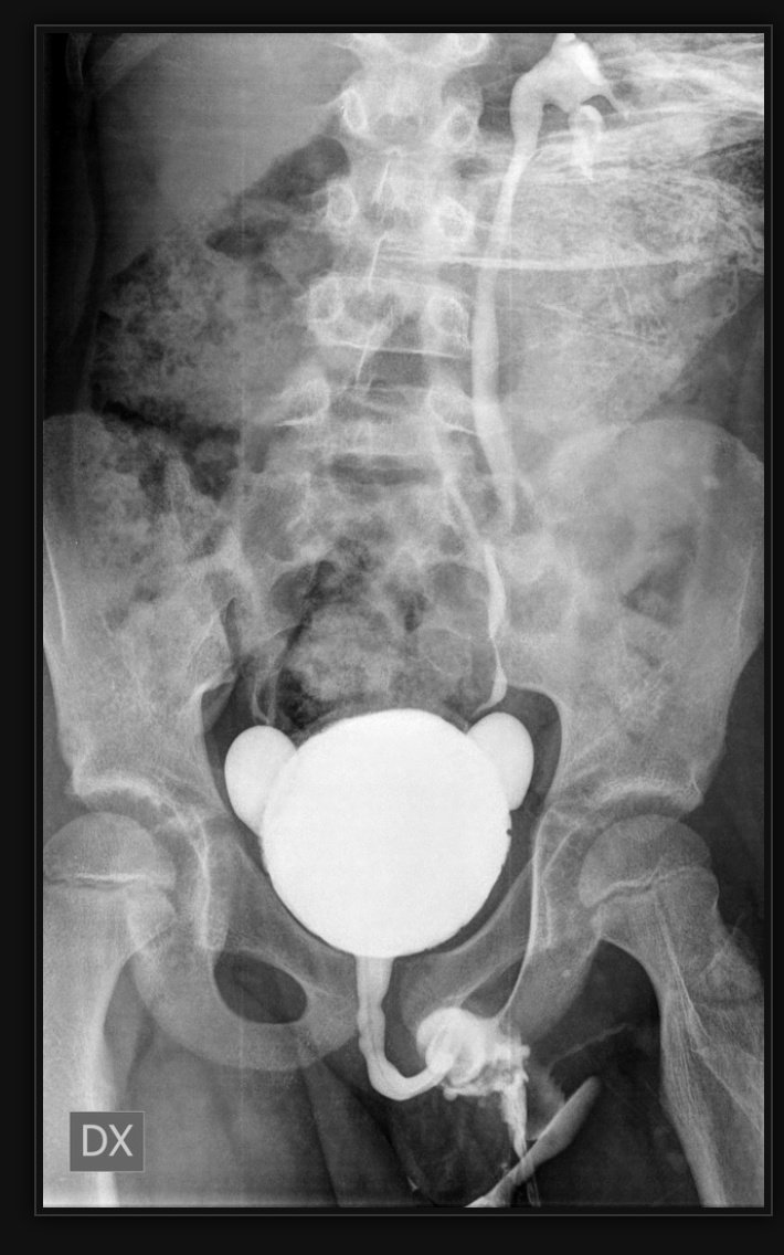 ويتضح انبعاج مزدوج للمثانة مع ارتجاع في الحالب الأيسر