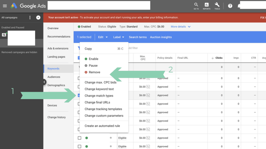 وتعتبر عامل مهم لتحريك الإعلان وتنميته.. ويجب ان تتاكد من استخدامك “Negative Keywords” والتي لا بد من تحسينها عن بالتحقق من مصطلحات وخيارات البحث..