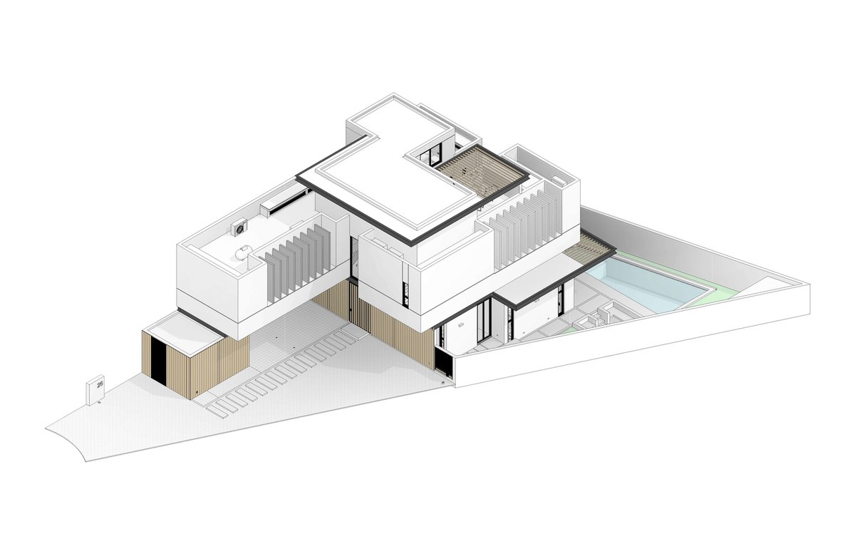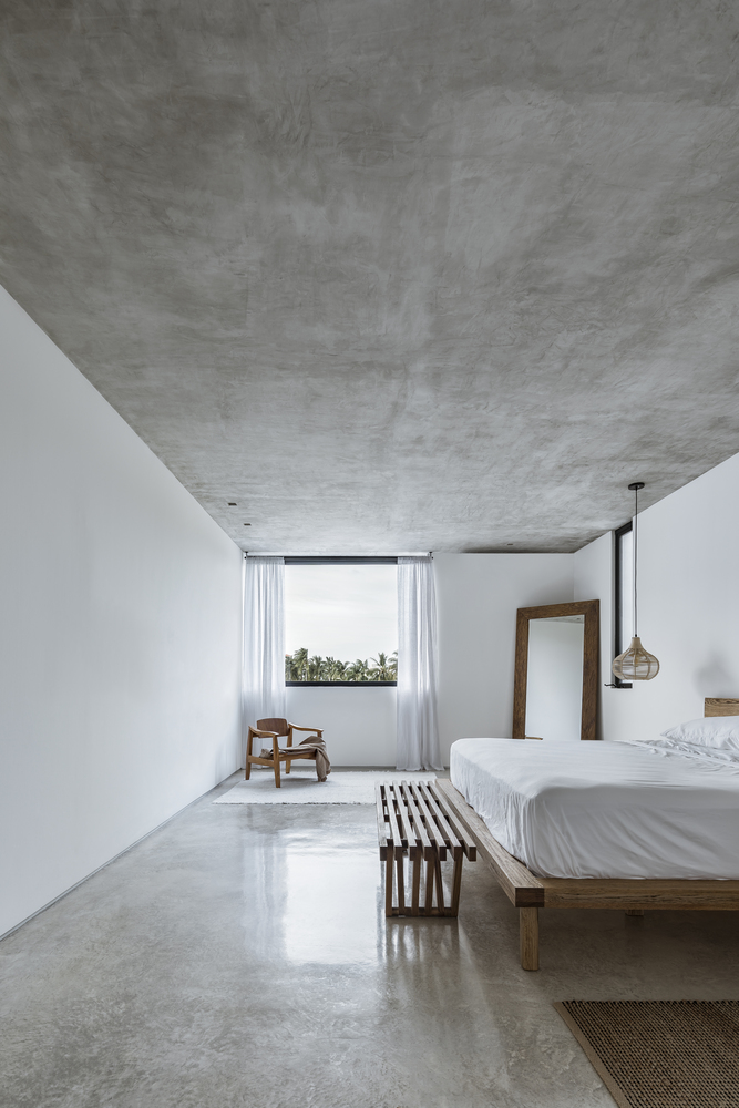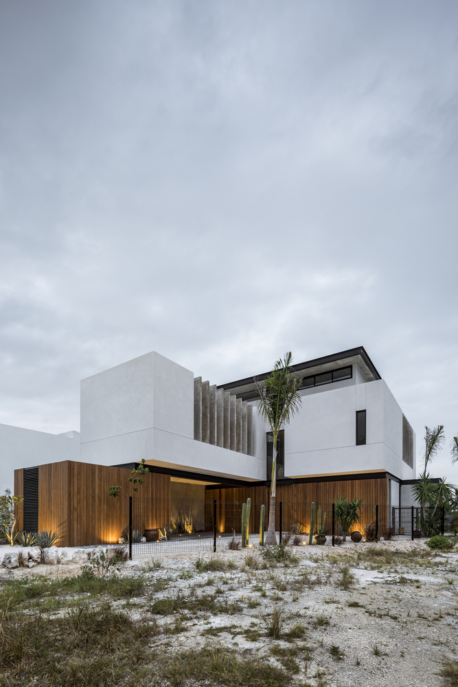 بساطة المواد في التشطيب بالدهان الأبيض وتطعيمات بالخشب والتلاعب بالكامل في التكوين الكتلي