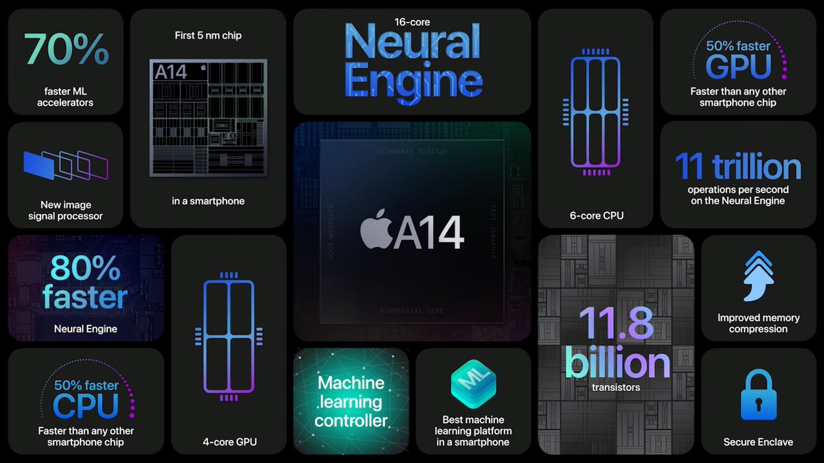 المعالج هو الـ A14 Bionic بمعمارية 5nm .. يقدم سرعة خارقة جدا تصل لـ 50٪ اسرع من اي معالج منافس.. نفس النسبة لمعالج الرسوم..