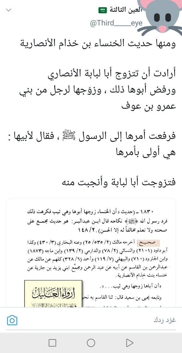 ١٣- عنها لكلام غيرهم، والفأر المتهم في دين الله @Third_____eye يدعي أنها آثار ضعيفة، وقد كذب، وسأسرد الآن هذه الآثار التي يقوي بعضها دلالة بعض