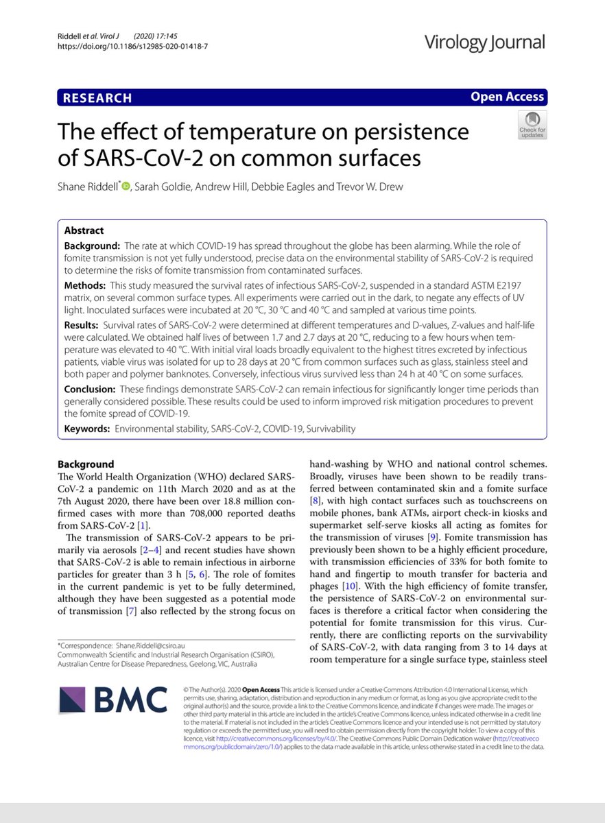 مدة بقاء الفايروس على الاسطح في ( الظلام)بدرجة حرارة مختلفة،وجدوا ان الفايروس يمكن ان يبقى على الاسطح في درجة حرارة ٢٠مؤية وليس هذا فقط بل يكون معدي أيضا!