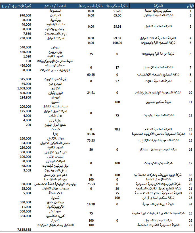 ما ذكرته آنفاً هو لتوضيح ترابط عمليات سبكيم وشركاتها وعلاقة مصانعها ببعضها البعض ولن ندخل في تفاصيل أعمق لأنها تخصصية أكثر وسأرفق لكم جدول يوضح شركات سبكيم ومنتاجاتها والطاقة الإنتاجية.