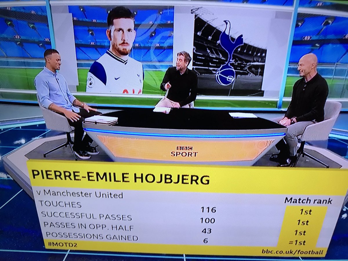 امام اليونايتد #هويبيرغ ايضاً كان اكثر لاعب في المباراة لعباً للتمريرات التقدمية ، كان بيعود للخلف بين قلوب الدفاع للصعود بالكرة كما يفعل دائماً، كل هحمة لتوتنهام في الثلث الاول يجب ان تمر على هويبيرغ.