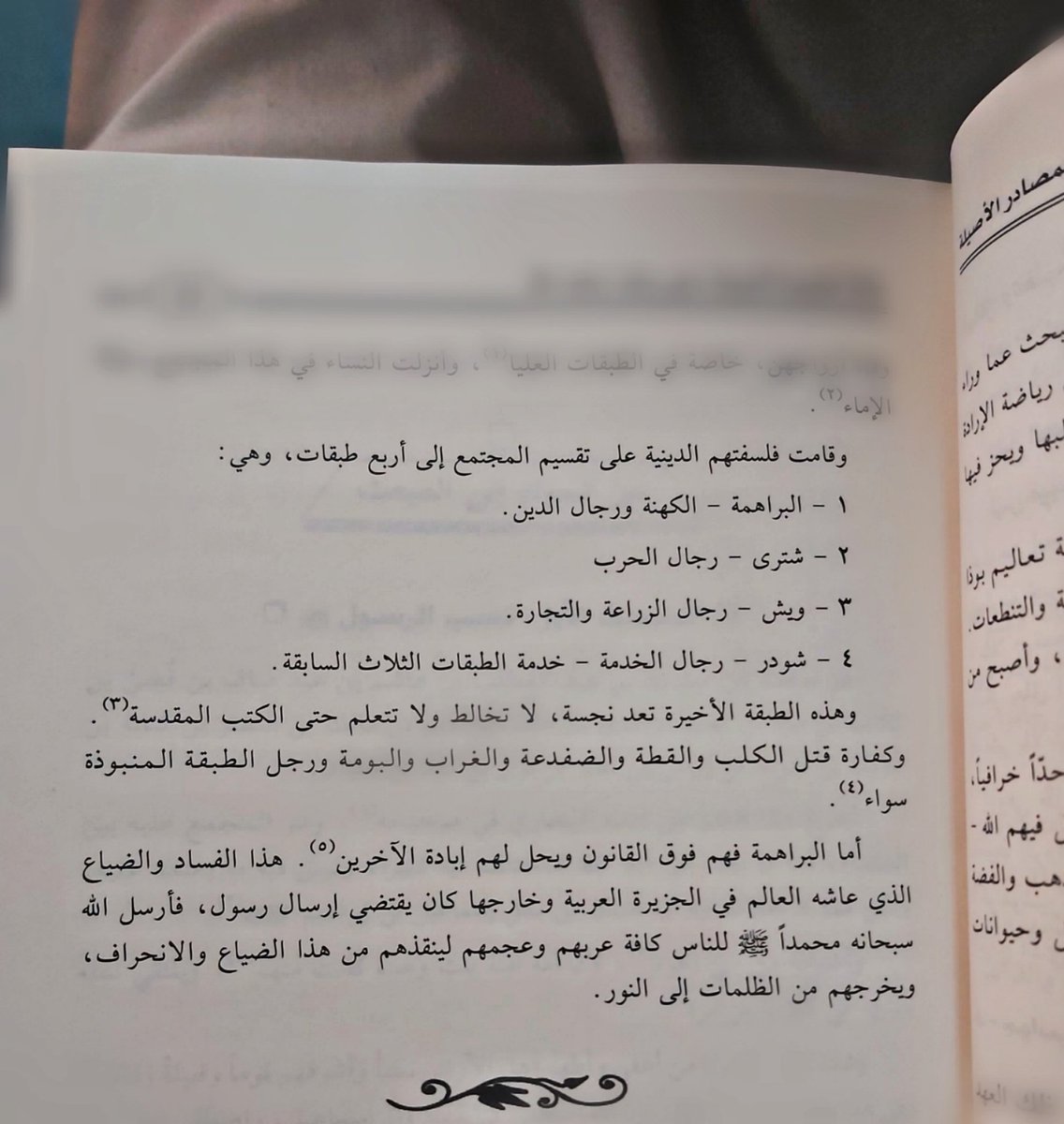 قامت فلسفتهم الدينية على تقسيم المجتمع إلى أربع طبقات، ومع هذا التقسيم والفساد والضياع، الذي عاشه العالم في الجزيرة وخارجها كان يقتضي إرسال رسول، فأرسل الله نبينا محمد ﷺ للناس كافة لينقذهم من هذا الضياع والانحراف