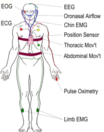 2- يستخدم تخطيط النوم مستشعرات لتسجيل مخطط كهربية الدماغ ، و #تخطيط_كهربية_القلب ، و #مخطط_كهربية_العضل ، #معدل_ضربات_القلب #أنماط_التنفس #مستوى_الأكسجين في الدم وضعية الجسم جميعها توفر بيانات تساهم في التشخيص