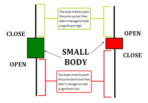 وفيها يكون سعر الأفتتاح قريب من سعر الأغلاق وأعلى سعر وإدنى سعر بعيّدين عن حدي الجسم الحقيقي