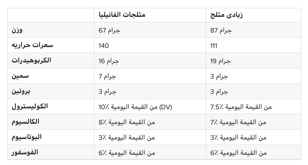 يحتوي كل من الزبادي المجمد والآيس كريم على منتجات الألبان والسكر. بينما يستخدم الزبادي المجمد الحليب المزروع، يستخدم الآيس كريم الكريمة، يميل الزبادي المجمد إلى أن يكون أقل في الدهون، ولكنه قد يحتوي على المزيد من السكر.