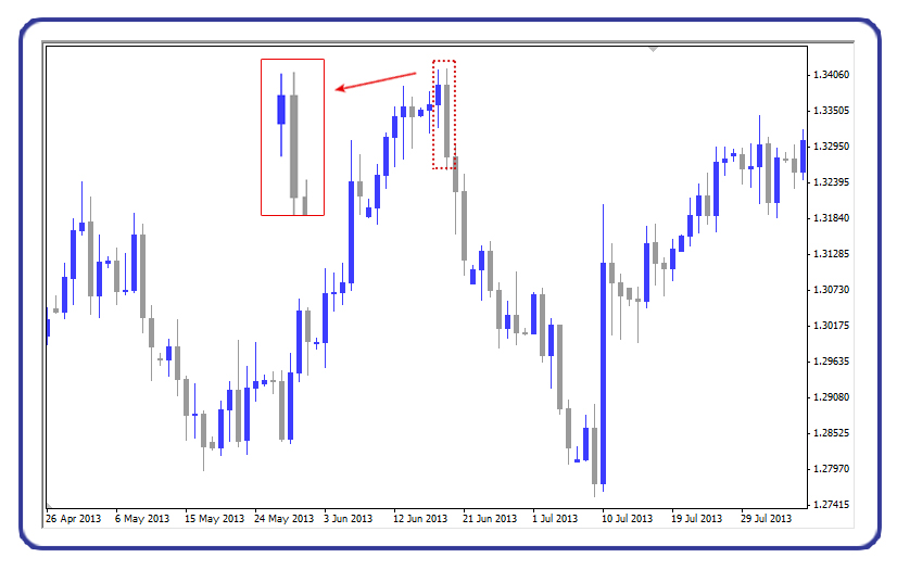 2- ثم تأتي إلينا شمعة مثل الموجودة في الصورة ذات اللون الفضي ويكون الارتفاع لهذه الشمعة أعلى من ارتفاع الشمعة السابقة لها، وانخفاضها يكون أقل من انخفاض الشمعة السابقة لها.