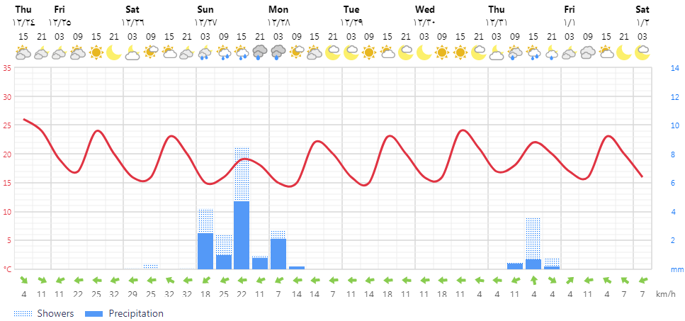 العظمى نهارا قد لا تتجاوز 15 وتكون حوله وأقل أيام الجمعه والسبت والاحد والإثنين ترتفع فوق15 الثلاثاء والاربعاء والخميس