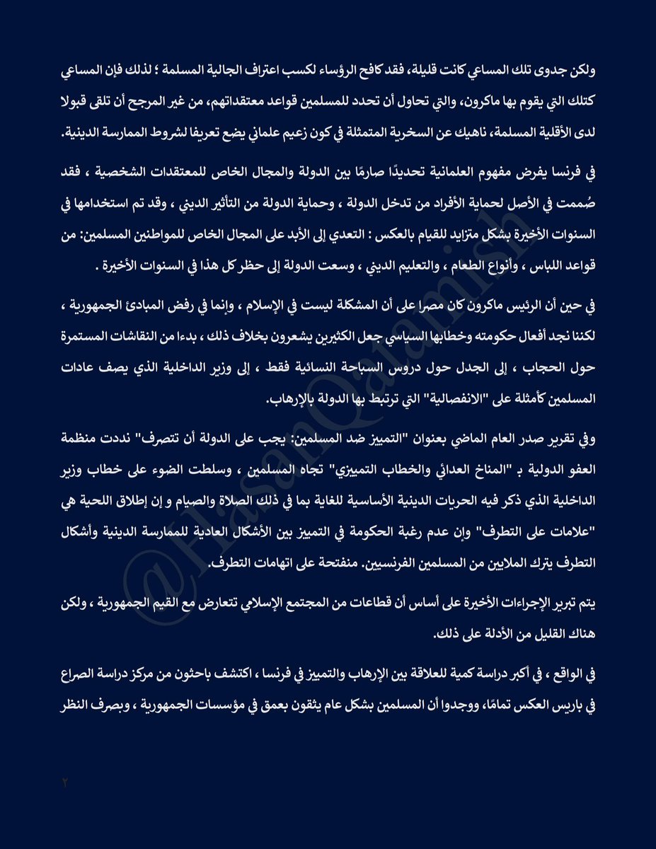 2. في #فرنسا صُمم مفهوم العلمانية في الأصل لحماية الأفراد من تدخل الدولة ، وحماية الدولة من التأثير الديني ، لكنه في السنوات الأخيرة وبشكل متزايد تم التعددي على خصوصية المواطنين المسلمين من قواعد اللباس ، وأنواع الطعام ، والتعليم الديني ، وسعت الدولة إلى حظر كل هذا .