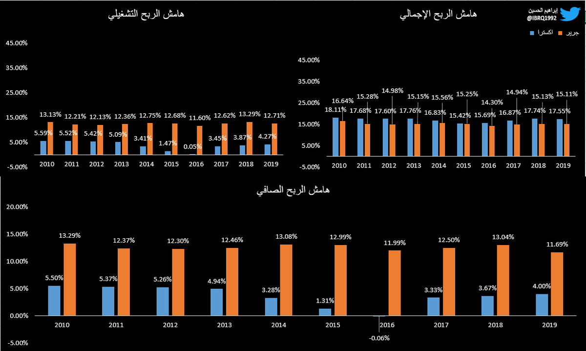 لاحظ تفوق اكسترا في هامش الربح الاجمالي لتتفوق جرير في هامش الربح الصافي والتشغيلي.