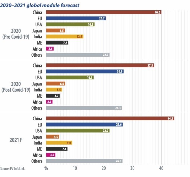 وشهدت العديد من الأسواق الرئيسية نموًا مبهرا في كل من الصين والولايات المتحدة و ألمانيا. وتتوقع PV InfoLink انخفاض اسعار الألواح الشمسية و زيادة نمو الأسواق بنهاية 2021