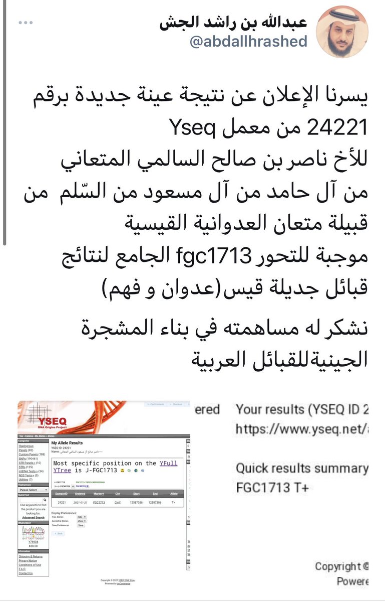 تكتلت نتائج قبيلة مطير أسفل التحور الجديلي القيسي fgc1713 مع نتائج قبيلة عدوان ثم مع نتائج قبيلة فهم وبطونها