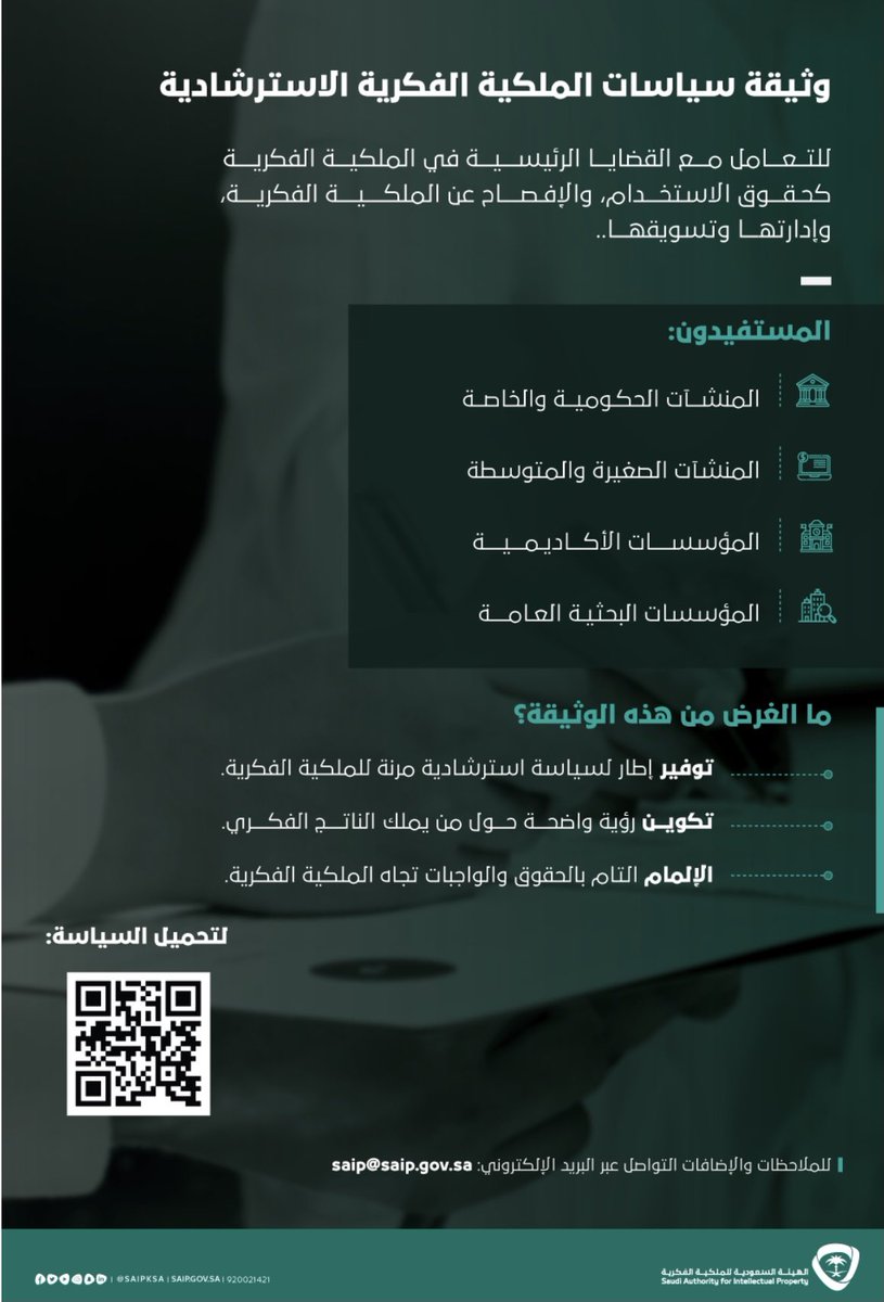 4️⃣ أصدرت @SAIPKSA وثيقة سياسات الملكية الفكرية الاسترشادية والتي تعد نموذج مهم يمكن للمنشآت التجارية والبحثية والأكاديمية الاستفادة منه عند صياغة سياساتهم الداخلية المتعلقة بالملكية الفكرية