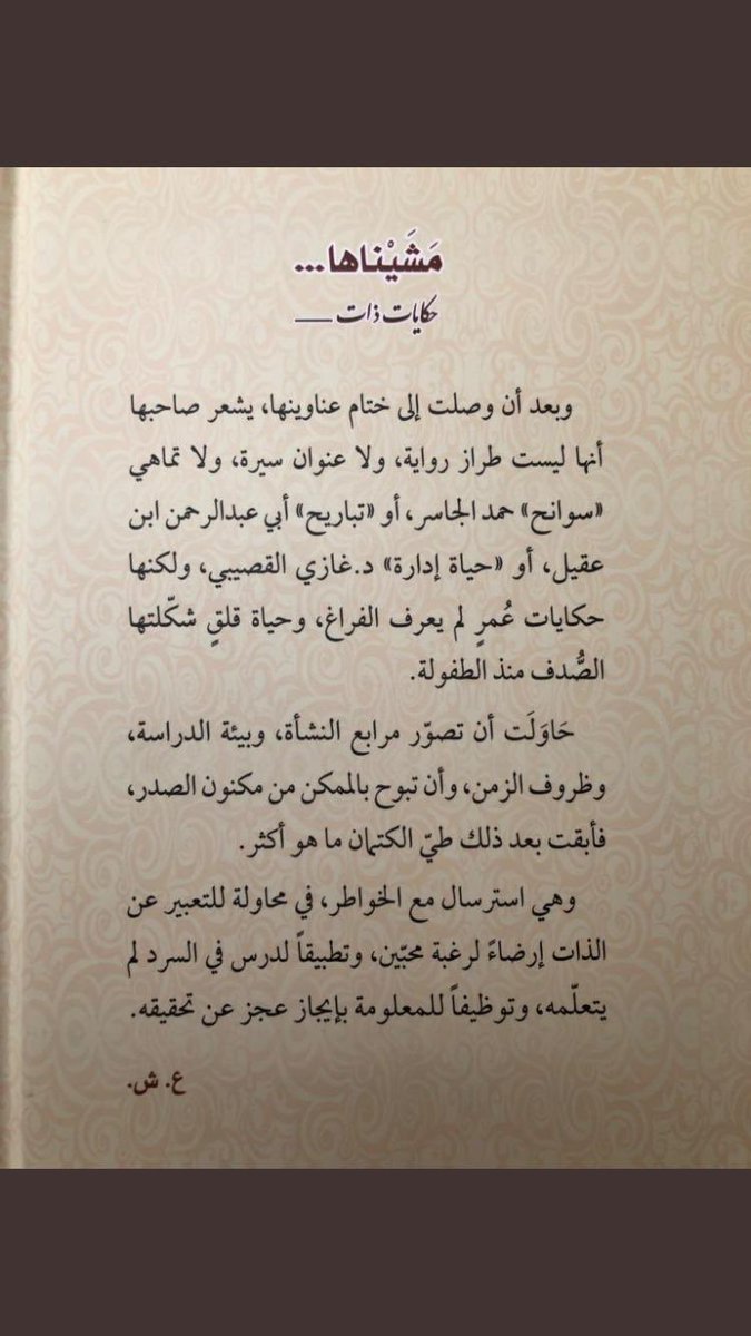 مشيناها: حكايات ذات، عبدالرحمن بن صالح الشبيلي (صدرت عام ١٤٤٠هـ/٢٠١٨م)، وتتوافر لدي بصيغة (PDF) لمن يرغب.