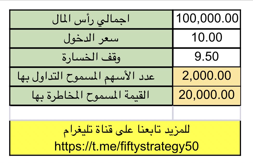 لمساعدتك انشأنا ملف بسيط على برنامج اكسل يحسب لك عدد الاسهم المسموح التداول بها والقيمة المسموح المخاطرة بها