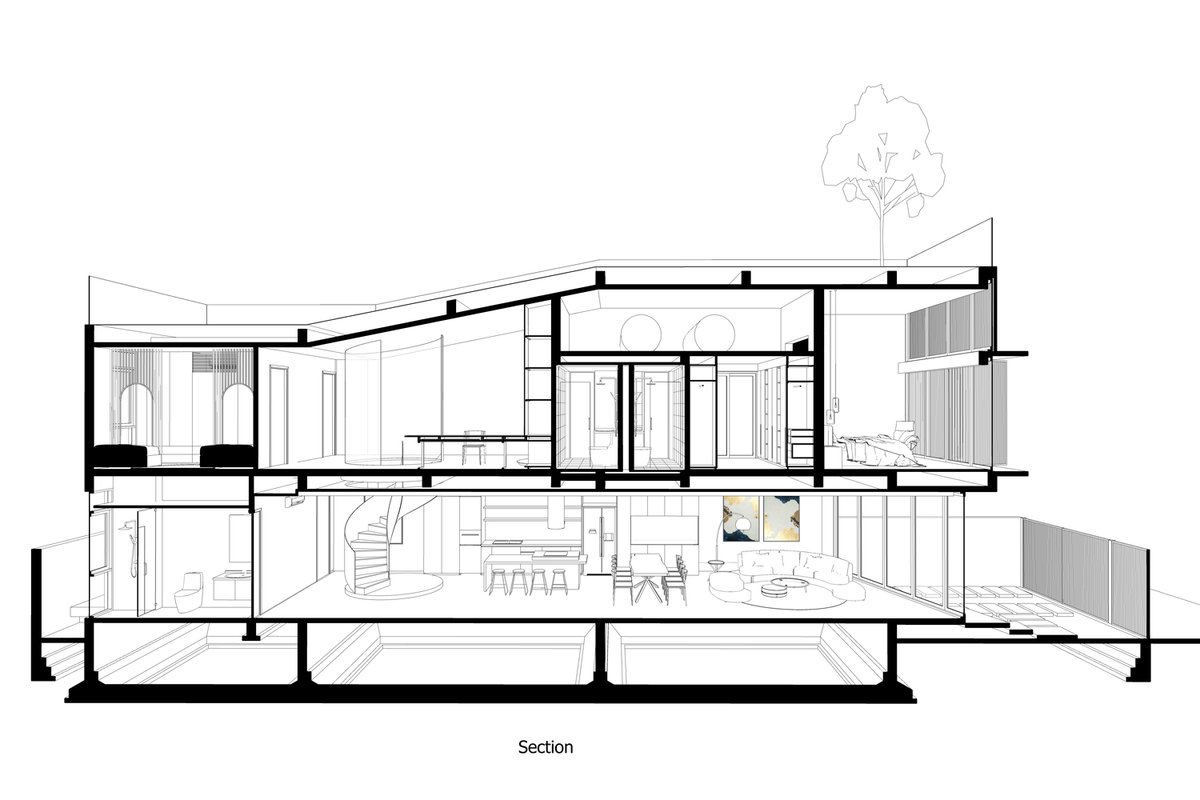 أما هنا فترى الحديقة الجانبية التي ترتبط بالحديقة العلوية بدرج مشجر كذلك , والأعمدة الجميلة لترفع المنزل لتشعرك أن المحيط الداخلي والخارجي واحد ,,,