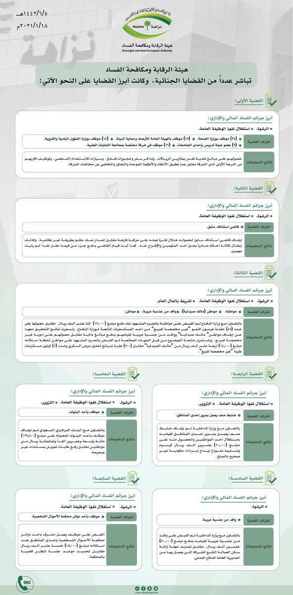 القضية 1: تورط (24) موظف بوزارة الصحة، و (15) موظف بالهيئة العامة للأرصاد وحماية البيئة، و(14) موظف بوزارة الشؤون البلدية والقروية، و (2) عضو هيئة تدريس بإحدى الجامعات، و (16) موظف في شركة مختصة بمعالجة النفايات الطبية؛ لحصولهم على مبالغ نقدية تقدر بملايين الريالات، وتذاكر سفر