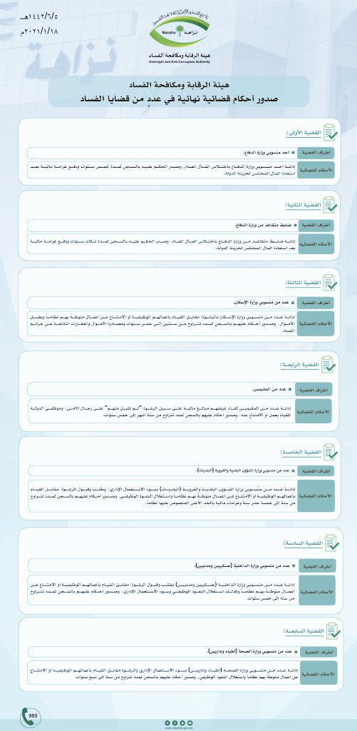 الحكم 5: إدانة عدد من منسوبي وزارة الشؤون البلدية والقروية بسوء الاستعمال الإداري، وطلب وقبول الرشوة؛ مقابل القيام بأعمالهم الوظيفية أو الامتناع عن أعمال منوطةً بهم نظاما واستغلال النفوذ الوظيفي، وصدور أحكام عليهم بالسجن لمدد تتراوح من 1 إلى