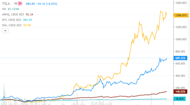 -الارتفاع محدود بأداء القطاع ككل والذي قد يكون أقل من أداء الأسهم المميزة. الصورة أدناه توضح التفوق الهائل لسهم #نيو $NIO بالأصفر و #تسلا $TSLA بالأزرق مقارنة بأداء مؤشر الـ #SP500 بالأخضر أو صندوق تكنولوجيا القيادة الذاتية $ARKQ بالبني للعام 2020⬇️
