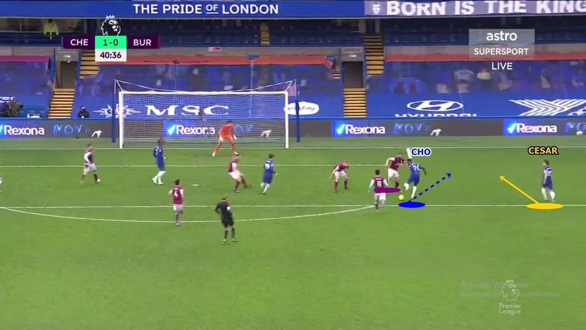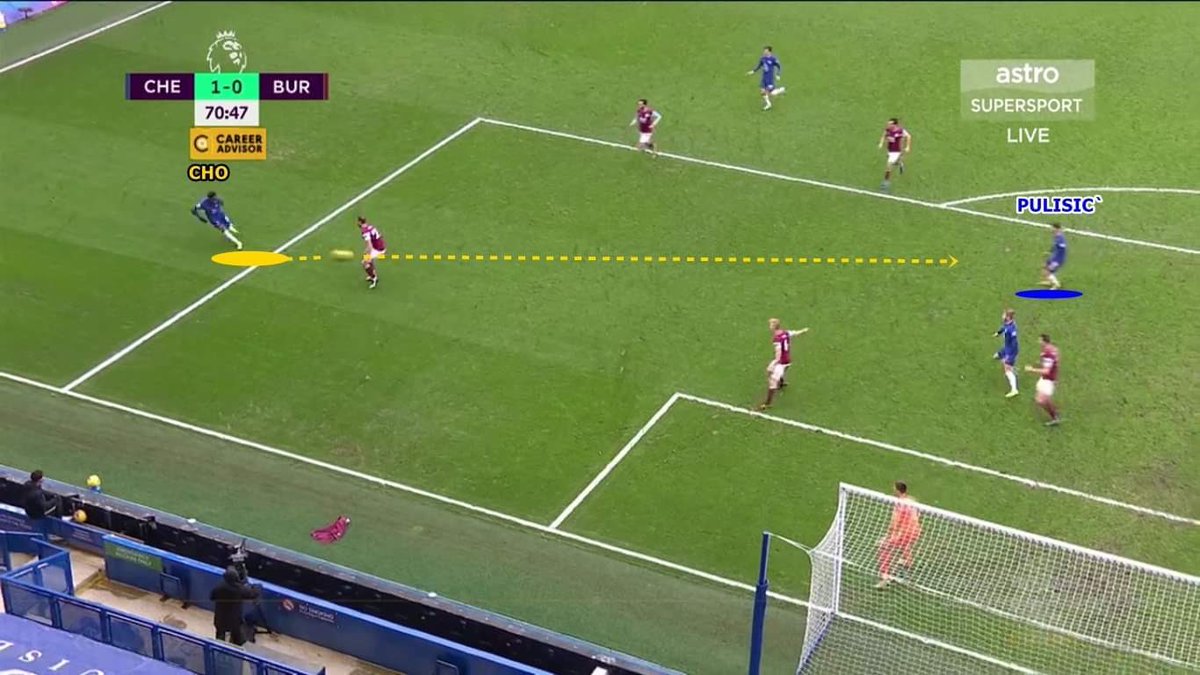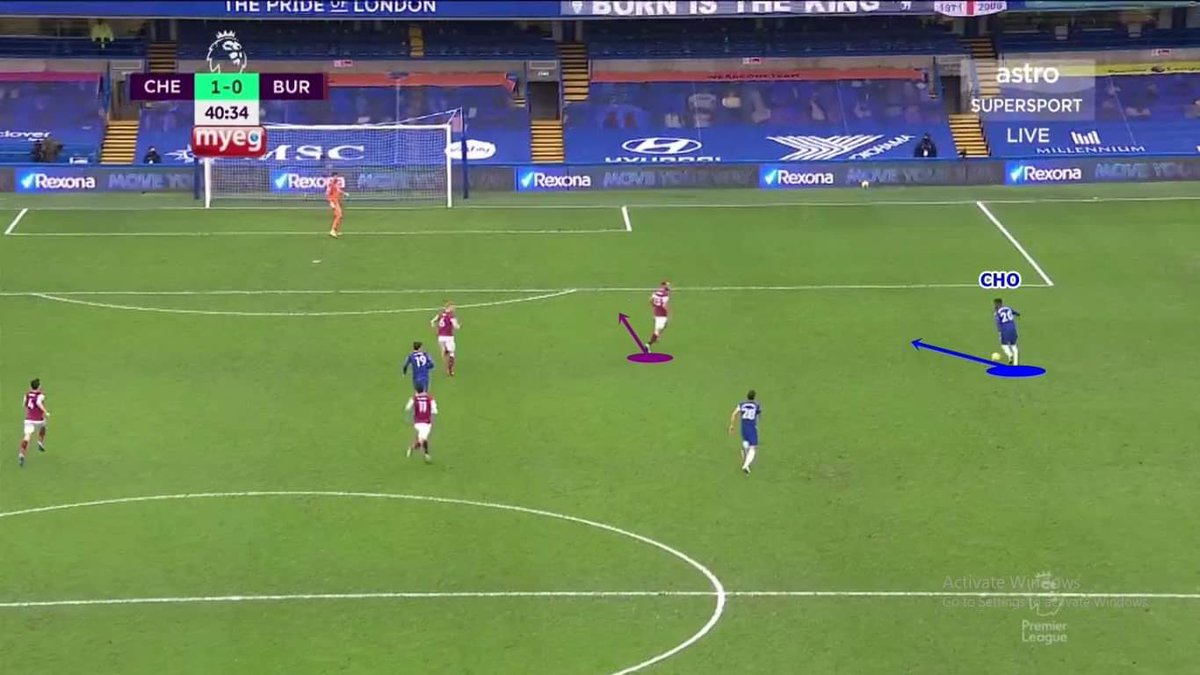 وعندما يستلم ماونت الكره في قدمه بين الخطوط ويسحب معه ظهير الخصم خارج مركزه، يتحرك سريعاً هودسون أودوي في ظهر الدفاع ويطلب الكره من ماونت في المساحه في ظهر مُدافعي الخصم