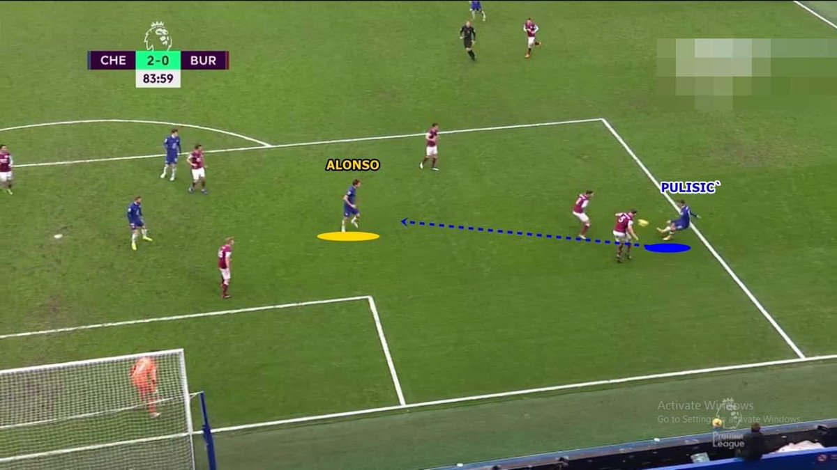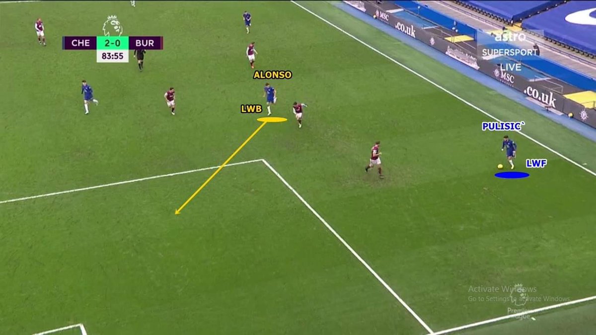 على الجانب الأخر تكون التحركات مختلفه ومتداخله فـ يطلب توخيل دائماً من الـwing back ألونسو ان يقوم بعمل inverted runs أو تحركات متداخله بجانب التواجد المستمر داخل منطقة الجزاء مع بقاء الجناح بالخارج