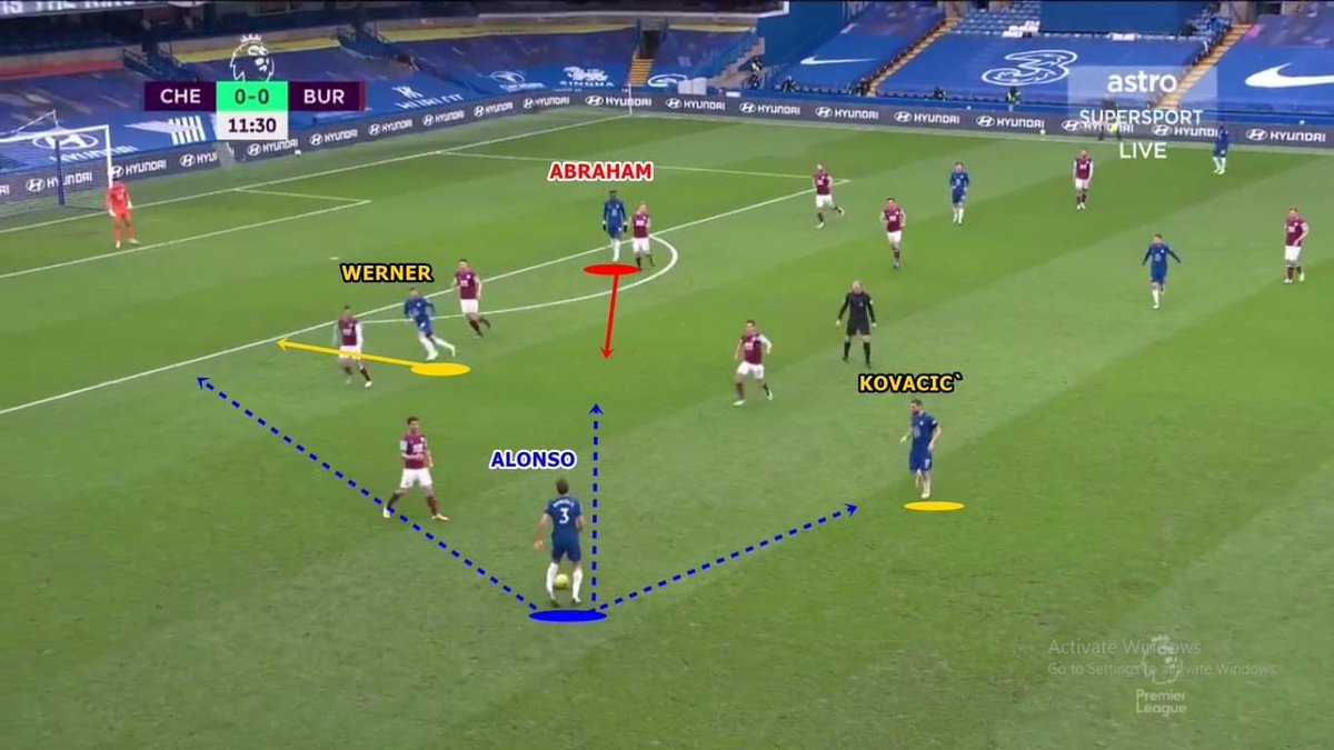 في تلك الحاله تحرك ڤيرنر في ظهر الدفاع ليسحب المدافع معه ويفتح مجال تمرير لـ إبراهام ولكن إبراهام لم يخرج لطلب الكره ولم يجد ألونسو أي حل للتمرير سوى التمرير العرضي لـ كوڤاسيتش.