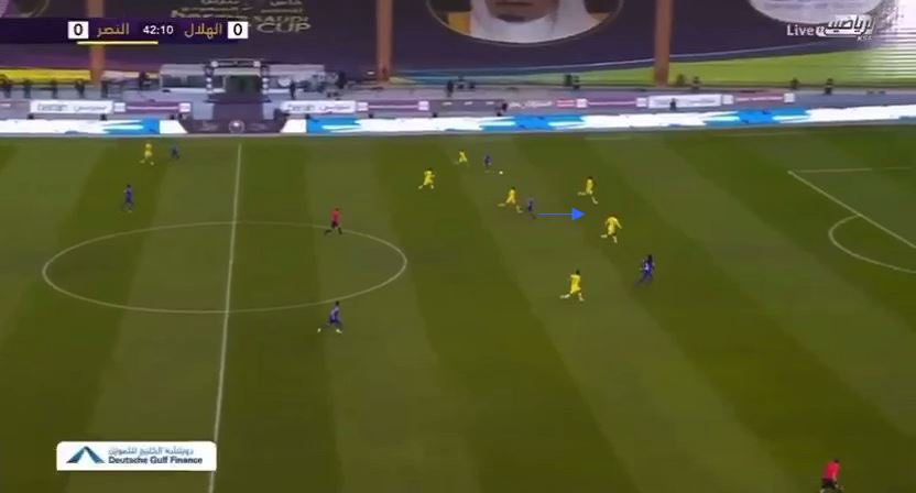 🔸في بداية المباراة وجد #النصر صعوبة في التقدم بالكرة عن الطريق الإنتقال بالكرة من ثلث إلى ثلث آخر، لهذا حين "جيوفينكو - غوميز" يقومون برقابة قلبي الدفاع يرسل مدافعي النصر كرات طويلة إلى "أمرابط" الذي لم يجد حلول كثيرة وغالب الكرات الطويلة كانت غير خطيرة أو تقطع من الفريق الأزرق