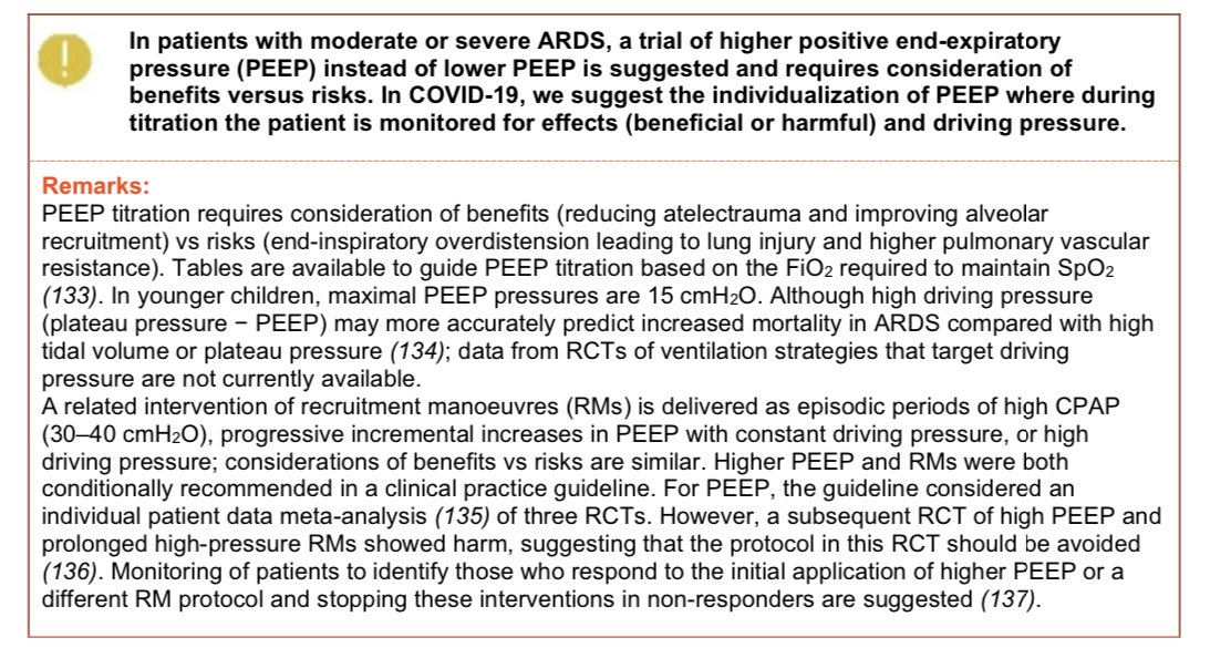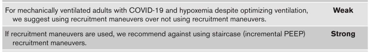 احب أن أضيف أن إستخدام (recruitment manoeuvre) مع (high PEEP strategy) يجب ان تكون اختيارية بناءاً على اختبار استجابة المريض لإعادة فتح و توظيف الرئة (assessment of 🫁 recruitability) فالدراسات اثبتت انها ممكن ان تضر ولا تنفع اذا لم يتم اختيار المريض المناسب بحسب قابلية الرئة.