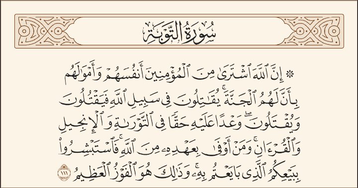 {إِنَّ ٱلله ٱشْتَرَىٰ مِنَ ٱلْمُؤْمِنِينَ أَنفُسَهُمْ وَأَمْوٰلَهُمْ بِأَنَّ لَهُمُ ٱلّجَنَّةَ…} (111)