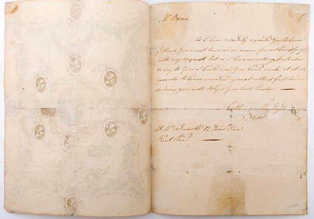 البطاقة تعود إلى عام 1797 وتتميز بتصميم رقيق مع صورة أنيقة لإمراة، أما الرسالة داخلها، فموجهة من سيدة تدعى كاثرين موسداي إلى رجل اسمه براون يعيش في لندن.