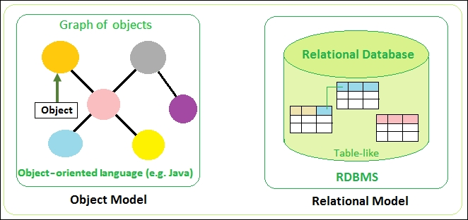 طيب واذا سوينا تحليل ونمذجة بمفاهيم الـ OOP وجينا نعمل ما يقابله في قواعد البيانات أو العكس بدأنا بنمذجة قواعد البيانات ومن ثم جينا نعمل نمذجة الـ OPP. في الأنظمة الكبيرة راح نلاقي تعقيدات بالغة وتعارضات كثيرة ملخصة في الجدول التالي: tutorialspoint.com