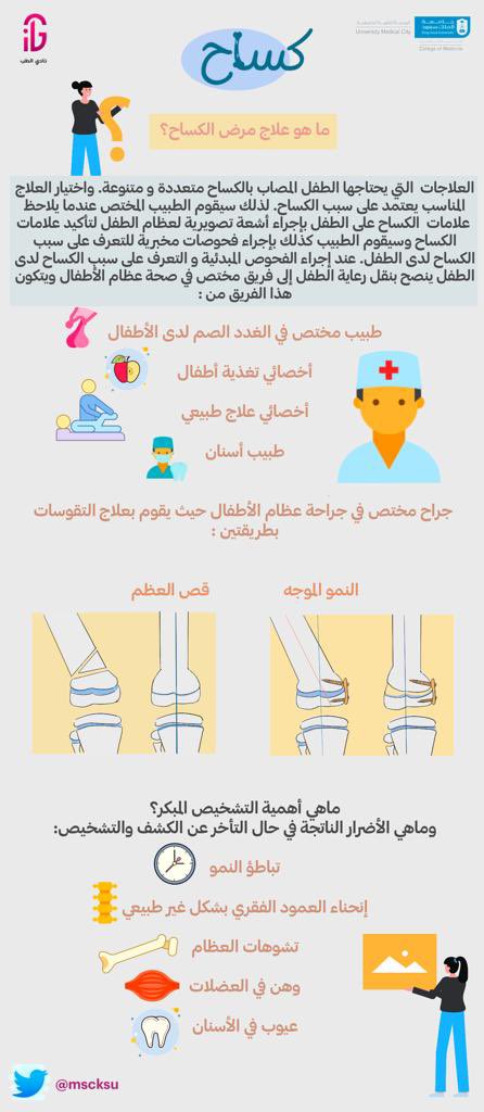 العلاجات التي يحتاجها الطفل المصاب بالكساح متعددة ومتنوعة، ويتم تحديد العلاج بحسب السبب المسبب له، ويحتاج الكُساح الى فريق طبي مختص في صحة العظام وهذا الفريق مكون من:👇🏻
