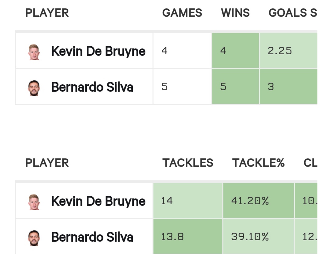 وتجدر الإشارة أيضًا إلى أن مباريات برناردو جاءت ضد وست بروميتش ، بيرنلي وليفربول خارج أرضه ، وشيفيلد يونايتد وتوتنهام على أرضه ، مقارنة بمباريات دي بروين الأربع على أرضه ضد نيوكاسل وبرايتون وكريستال بالاس وأستون فيلا. وكان في الواقع مصابًا عندما سجل السيتي أهدافه في مباراة فيلا .