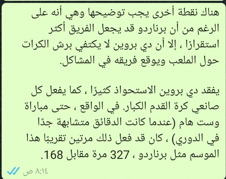 إنهما نوعان مختلفان من اللاعبين ، ولا يقومون بنفس الوظيفة حتى عندما يأخذون مركز رقم 8 في الفريق. من أجل المقارنة ، سنلقي نظرة على 4 مباريات في الدوري لعبها دي بروين في خط الوسط و 5 مباريات استبدلها برناردو.