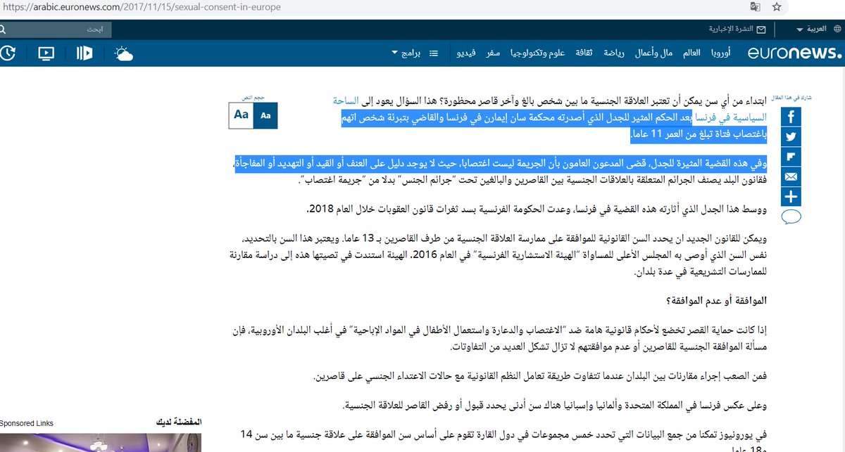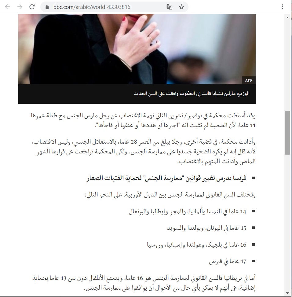 🔹ظل سن التراضي بفرنسا 10سنين ليرتفع ل13 بالقرن19 ثم15 لتتجدد المطالب اليوم بإرجاعة لـ13 فاكثر من ألف فتاة بين 12و14سنة تحمل سنويا والحل المقترح مجانيةحبوب منع الحمل