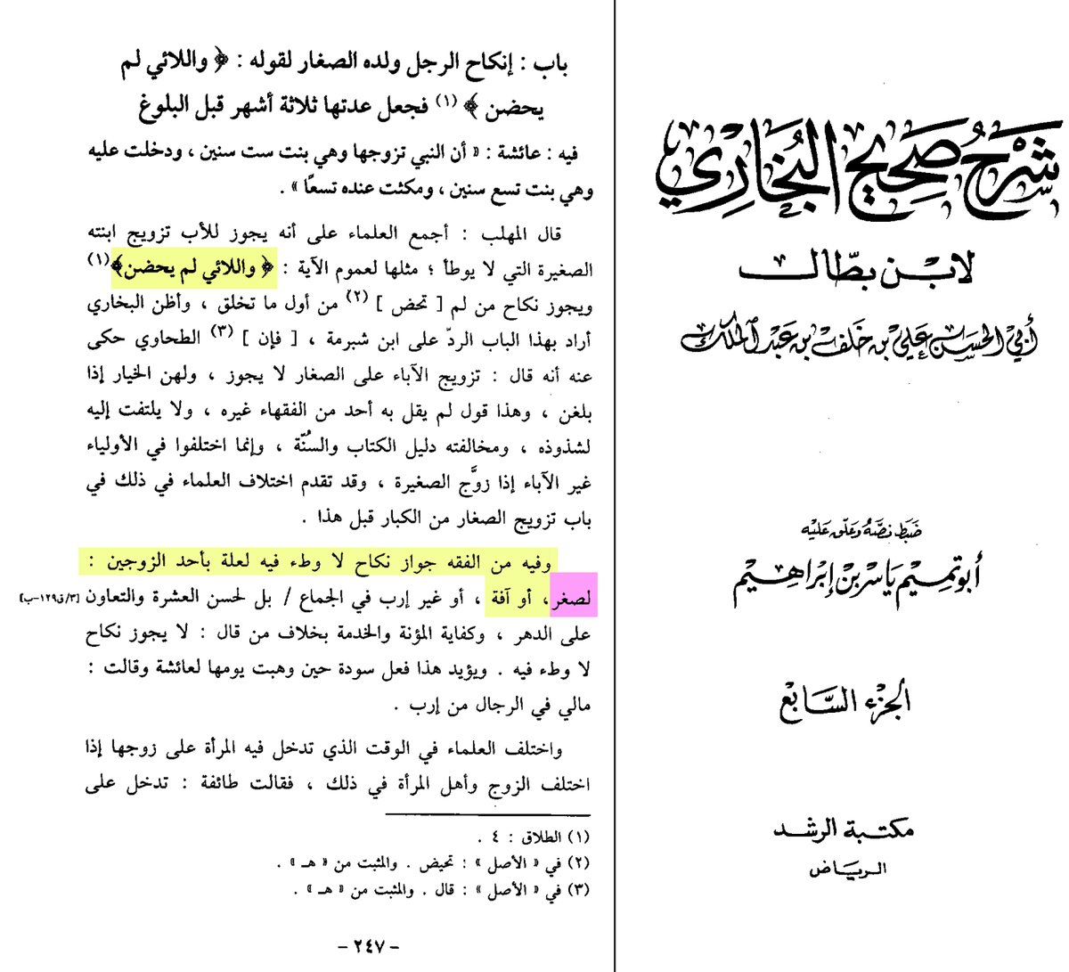 خطبت لجبير بن عدي قبل النبي وسن9 من 14قرن لم تكن طفلة ع زواج بدليل أن(خولة)رشحتها لذلك وعائشة وأم سليم كانتا تحملا القرب تسقي جرحى أُحد بمجهود لا يقارن غير أن 9سن بلوغ للأن وظل سن زواج قانوني باسكتلندا لعام1900 وكان سن التراضي بأمريكا 10و12 و7 في(ديلاوير)
