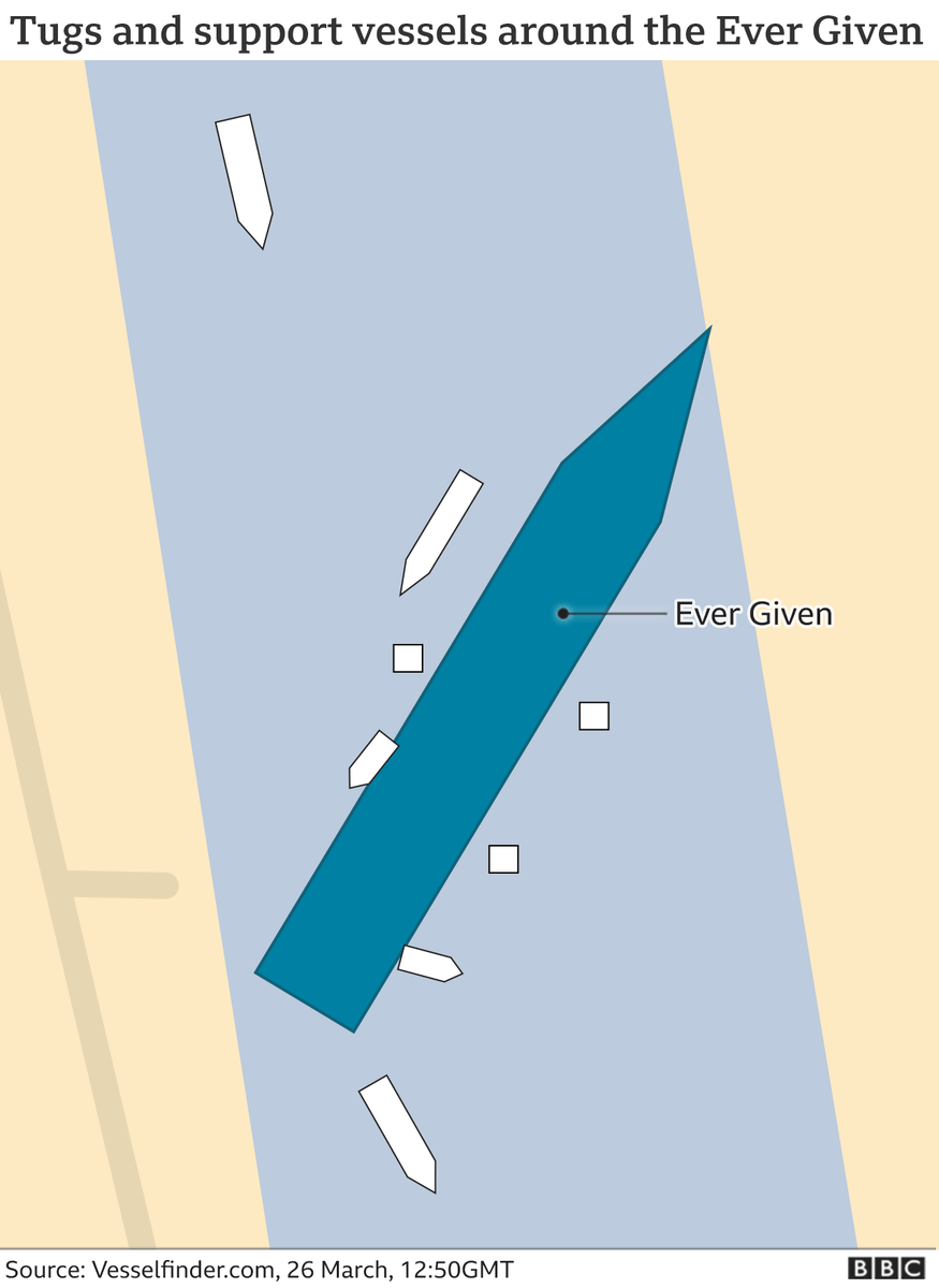 الوضع حتى اللحظة ان السفينة ما زالت عالقة من مقدمة ة مؤخرة السفينة و ان حركة الملاحة في القناة قد توقفت و السفن تكدست من الجهتين.