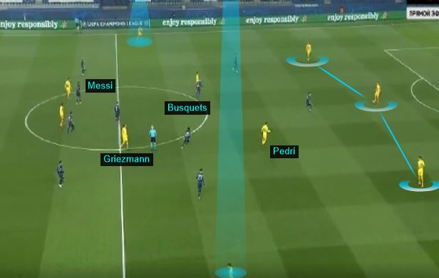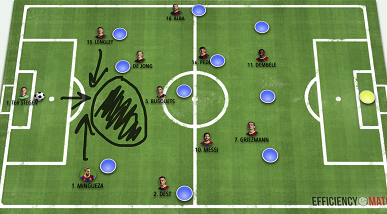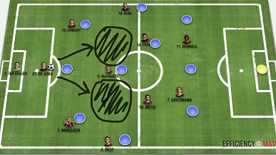 Una maniobra que casi siempre completa liberando pase y, en consecuencia, generando una clara ventaja para el compañero que va a recibir dandole más espacio y tiempo. Si el que recibe es Messi, es muy probable que acabe en peligro