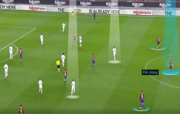 1-ANIQUILAR PRESIÓN RIVAL: La presencia de De Jong permite salir de cualquier presión, incluso una presión a pares porque tiene diferentes vías para ello. La primera es salir de zona para arrastrar a su marca y liberar línea de pase. Si es necesario luego aparecer