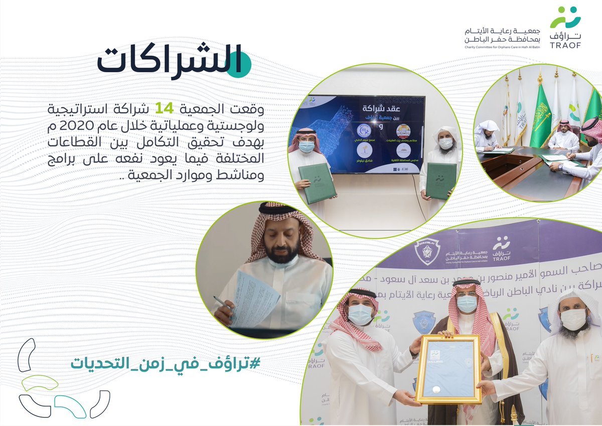 ولأننا شركاء في نماء وبناء الوطن مع كافة قطاعاته ومؤسساته ومنظماته , فقد وقعت #تراؤف في عام 2020 م 14 شراكة استراتيجية ولوجستية وعملياتية بهدف تحقيق التكامل بين القطاعات المختلفة فيما يعود نفعه على موارد الجمعية ومستفيديها ..