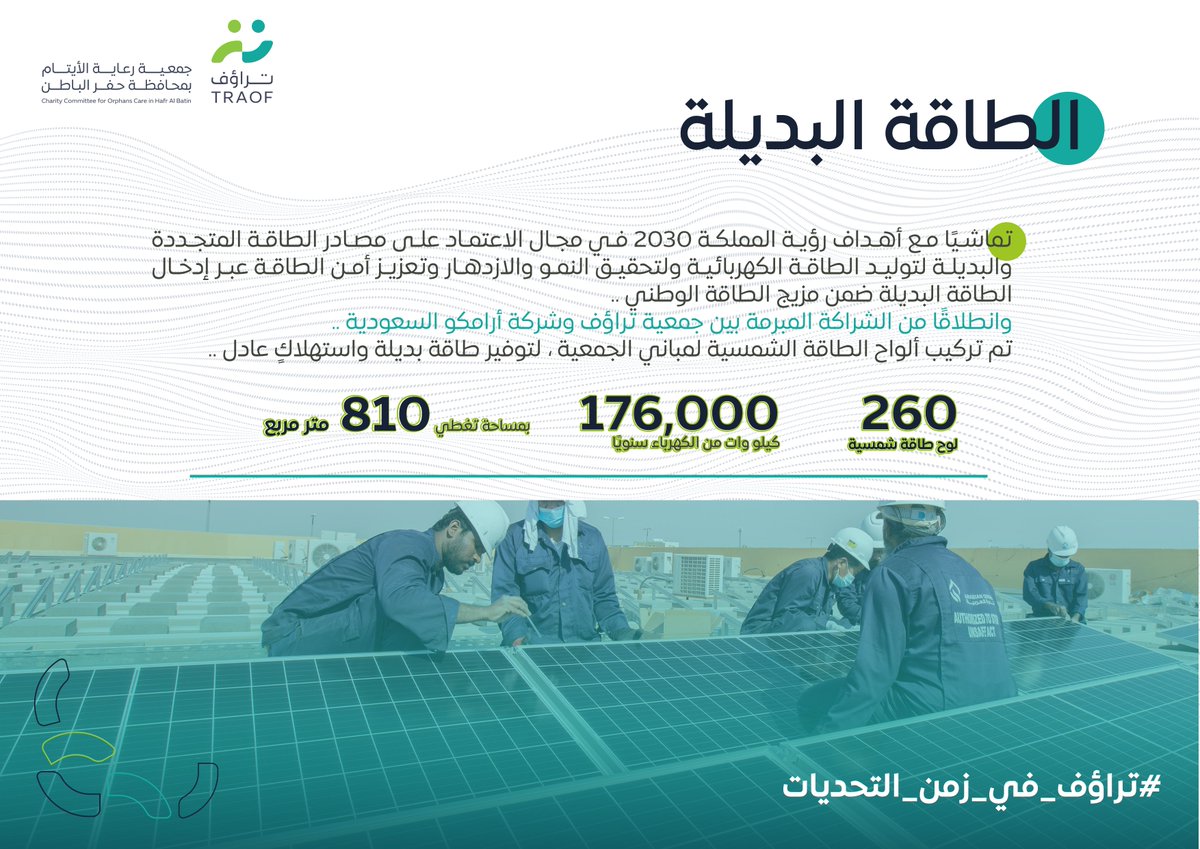 تماشيًا مع أهداف رؤية المملكة 2030 في مجال الاعتماد على مصادر الطاقة المتجددة والبديلة , فقد أثمرت شراكتنا المبرمة مع أرامكو السعودية بتركيب ألواح الطاقة الشمسية لمباني الجمعية لتوفير طاقة بديلة واستهلاك عادل ..