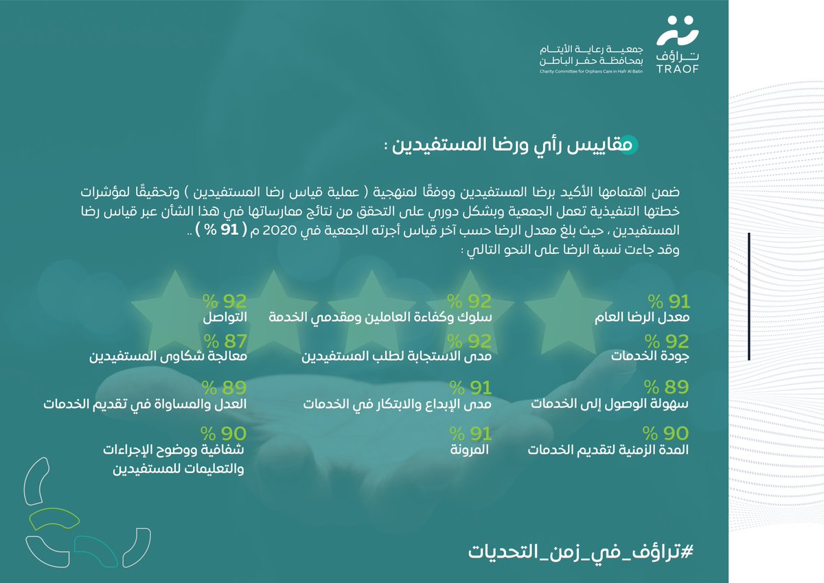 لتتوج المنجزات بحصول الجمعية على جائزة المؤسسات المتميزة في مجال رعاية الأيتام الدولية 2020 وتتويج أنديتها بالمركز الأول على مستوى المملكة بـ جائزة التميز في العمل الخيري ، كما تلقت تراؤف 113 تكريما وتهنئة من أصحاب السمو والمعالي والمسؤولين وكافة القطاعات