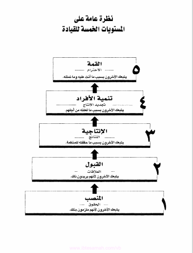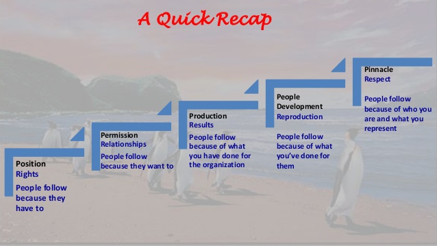 فعندما نتحدث عن قائد بالنتائج فهو ناجح في إدارة العلاقات وقائد بالمنصب، فكل مستوى معناه أن ما قبله مكتسب لكن أحيانًا يكون عندك قائد بالنتائج ولديه مشاكل في إدارة العلاقات، قوي في النتائج لكن لديه مشاكل في العلاقات. لكن الأمثل هو أن تحقق نتائج دون الأضرار بالعلاقات،،
