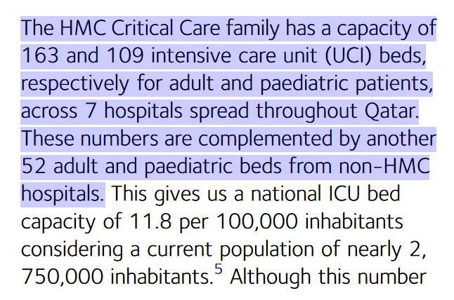 1- حددت إحصاءات 2019 العدد الكلي لأسرة العناية المركزة في #قطر بـ324 سريراً، لكن سعادة د. حنان الكواري صرحت بتاريخ 8-5-2020 أنه بالإمكان توسعة هذه الطاقة إلى 700 سرير إن لزم الأمر. مع وصولنا إلى 379 حالة عناية مركزة، نكون استنفدنا الطاقة الاستيعابية العادية و دخلنا في الاحتياط.
