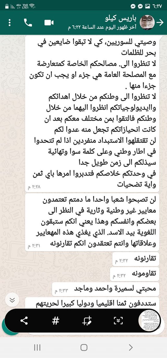 انتهت وصية المناضل #كيلو الذي نرجو له الإنتصار على المرض فما زالت الثورة بحاجة فكره النضر وروحه الجامعة المحبة لكل السوريين