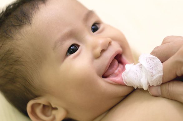 بتدليك اللثة بالأصبع أو بقطعة قماش نظيفة ولتسهيل عملية التسنين استخدم العضاضة أو حلقة التسنين.