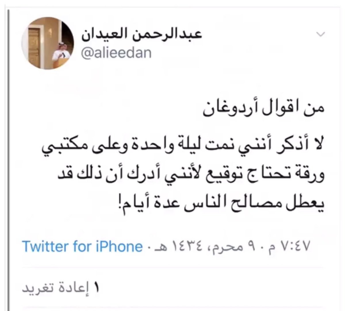 هذه التغريدات ذات النفس الاردوغاني هي ل عبدالرحمن العيدان رئيس مجلس ادارة الجمعية المهنية للحرفيين السعوديين ، مدير عام الجمعية السعودية للمحافظة على التراث #نحن_تراثنا @shpsevents فهل تستطيع ان تصدق او تتصور ذلك !!