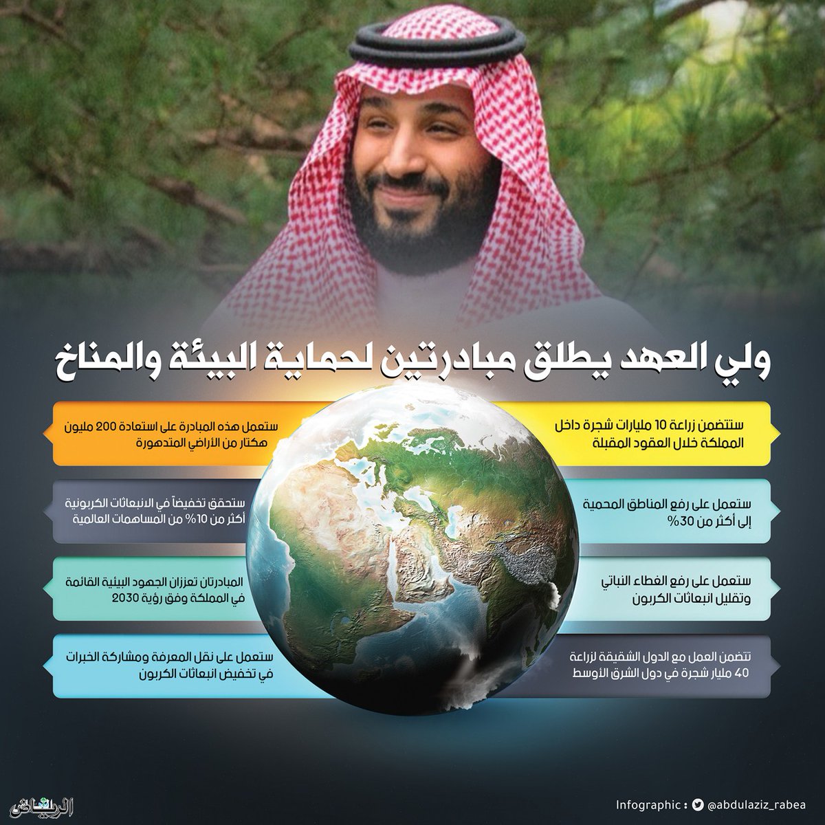 حيث تأتي هذه التغريدات تزامنا مع إعلان سمو #ولي_العهد_الامير_محمد_بن_سلمان حفظه الله لمبادرة #السعودية_الخضراء @Gi_Saudi التي تستهدف زراعــة 10مــلــيــارات شــجــرة داخــل المــمــلــكــة مــايــعــادل إعــادة تــأهــيــل حـوالـي 40 مـلـيـون هـكـتـار مـن الأراضـي المـتـدهـورة.